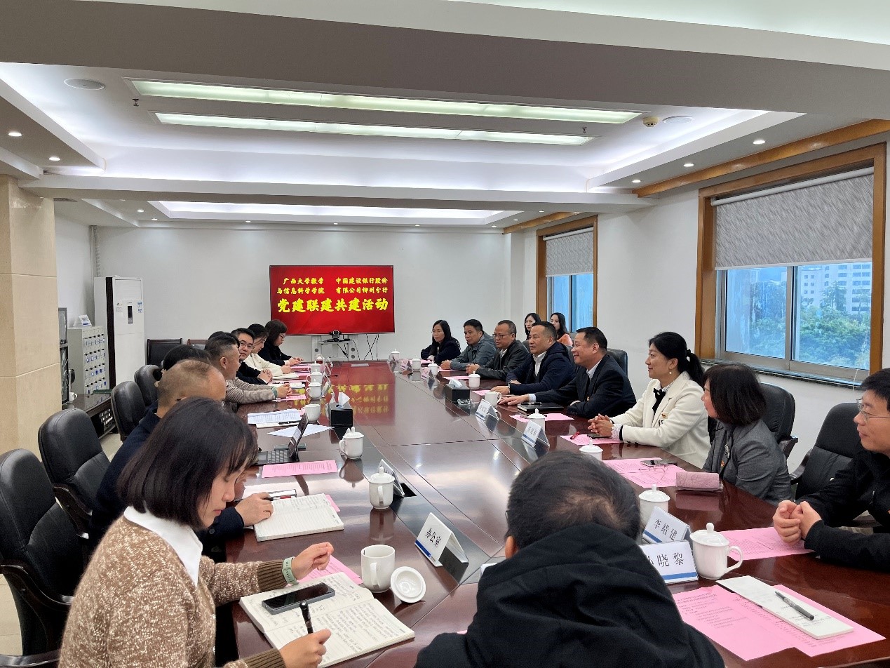 覃宪儒代表学院党委与中国建设银行柳州分行党委书记、行长郭劲军达成了党建共建联建合作意向,郭真华介绍了学院数学学科发展优势、特色,并提出了双方共融共创战略合作方向,双方在人才联培、实习实训、招聘计划等方面达成一致意向。
