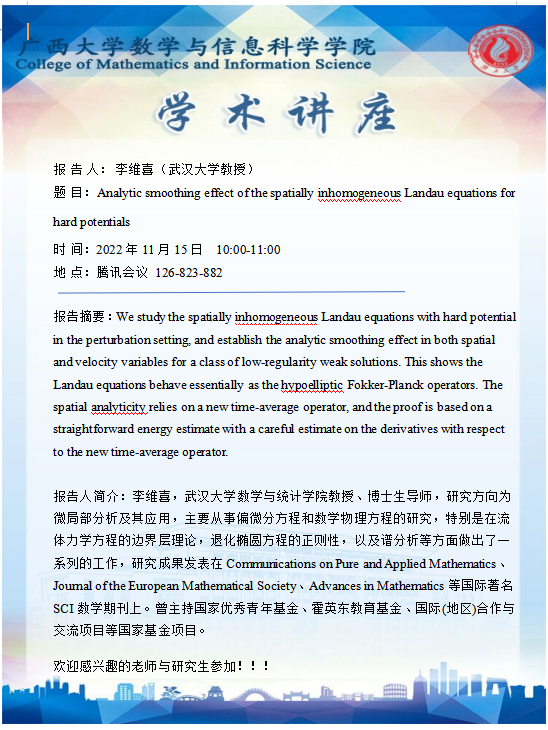 学术讲座:Analytic smoothing effect of the spatially inhomogeneous Landau equations for hard potentials