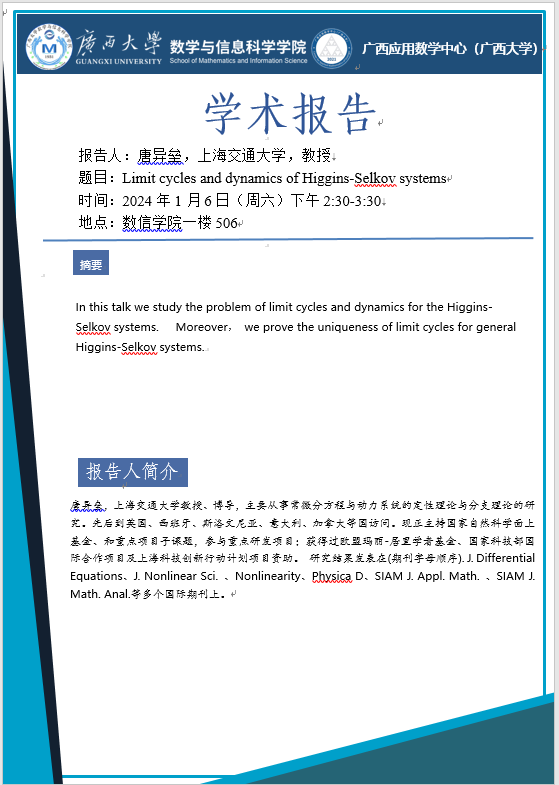 学术报告:Limit cycles and dynamics of Higgins-Selkov systems