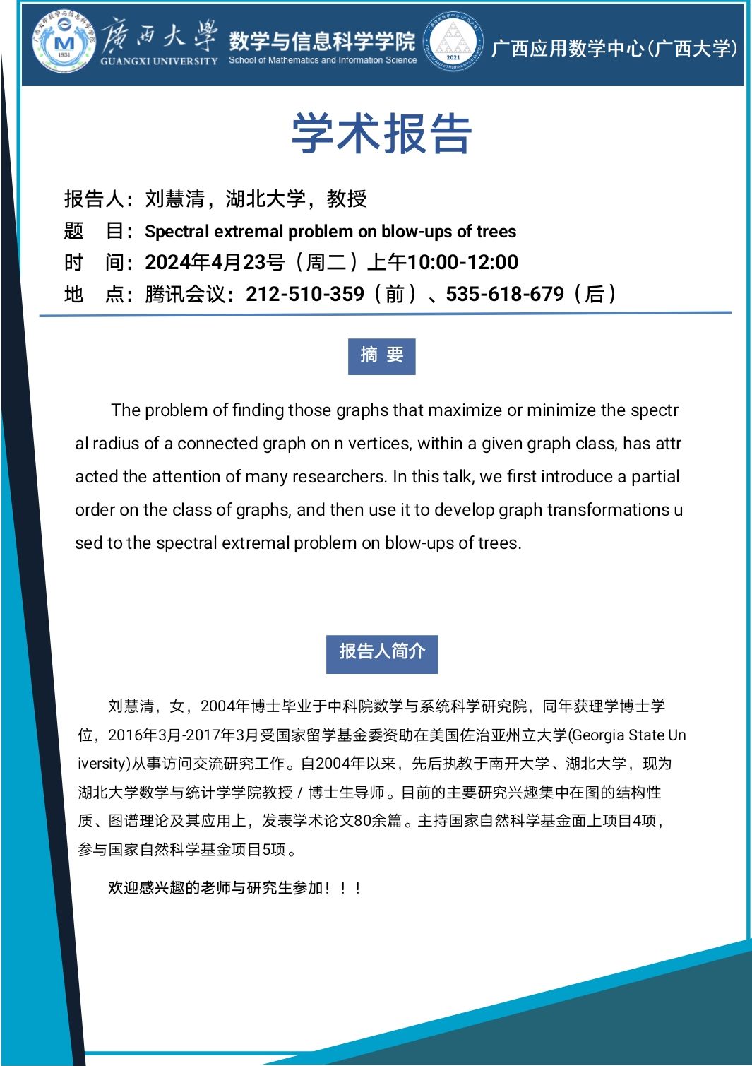 学术报告:Spectral extremal problem on blow-ups of trees