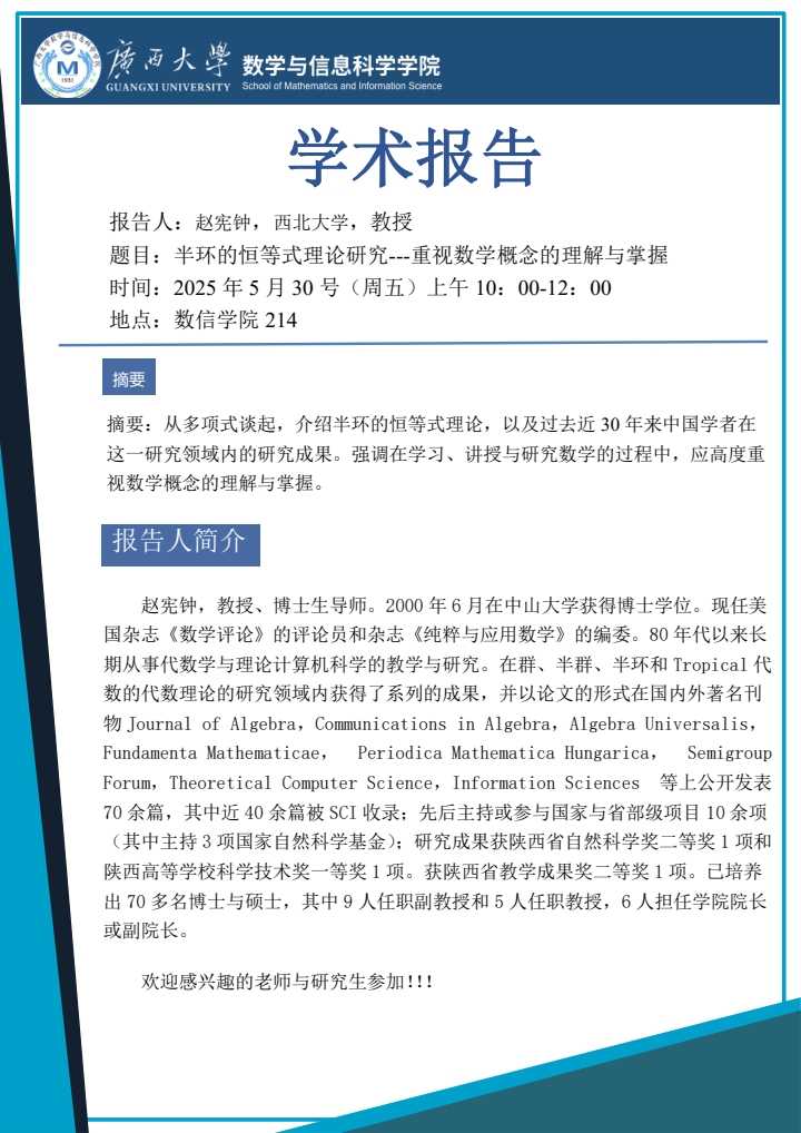 学术报告:半环的恒等式理论研究---重视数学概念的理解与掌握