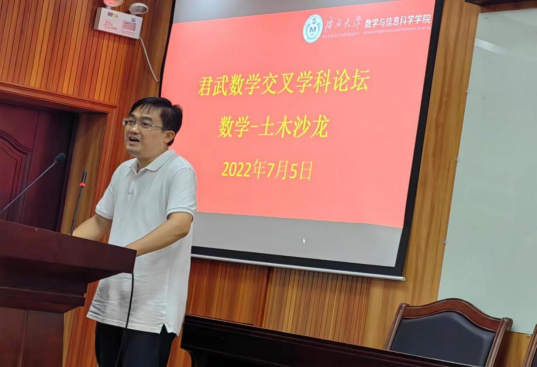 土木建筑工程学院副院长陈立华作了题为《国家水安全——洪涝预警面临形势及分析模型求解需求》的学术报告。陈立华副院长从城市内涝预警与风险评估难点、物理机制分布式岩溶水文模型等五个方面详细描述了水利研究方向对数学求解的迫切需求。他说,土木学科很多老师的研究课题急需数学学科的帮助和支持,希望两院有更多的机会寻找合作切入口,共同促进学科发展。