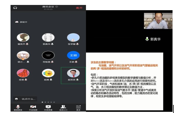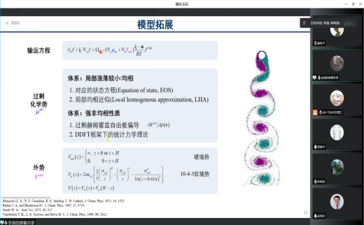 吕文琦助理教授、华东理工大学副教授徐小飞副教授等六位与会者进行了学术演讲。演讲内容包括非线性偏微分方程中的几类流体力学方程的研究概况与最新研究进展,以及化学高分子改性对表面催化反应和扩散的影响、耦合流体结构的微观传递理论等。会议上大家发言踊跃、讨论充分,明确了下一步合作的方向,期待针对具体的问题继续开展合作研究。