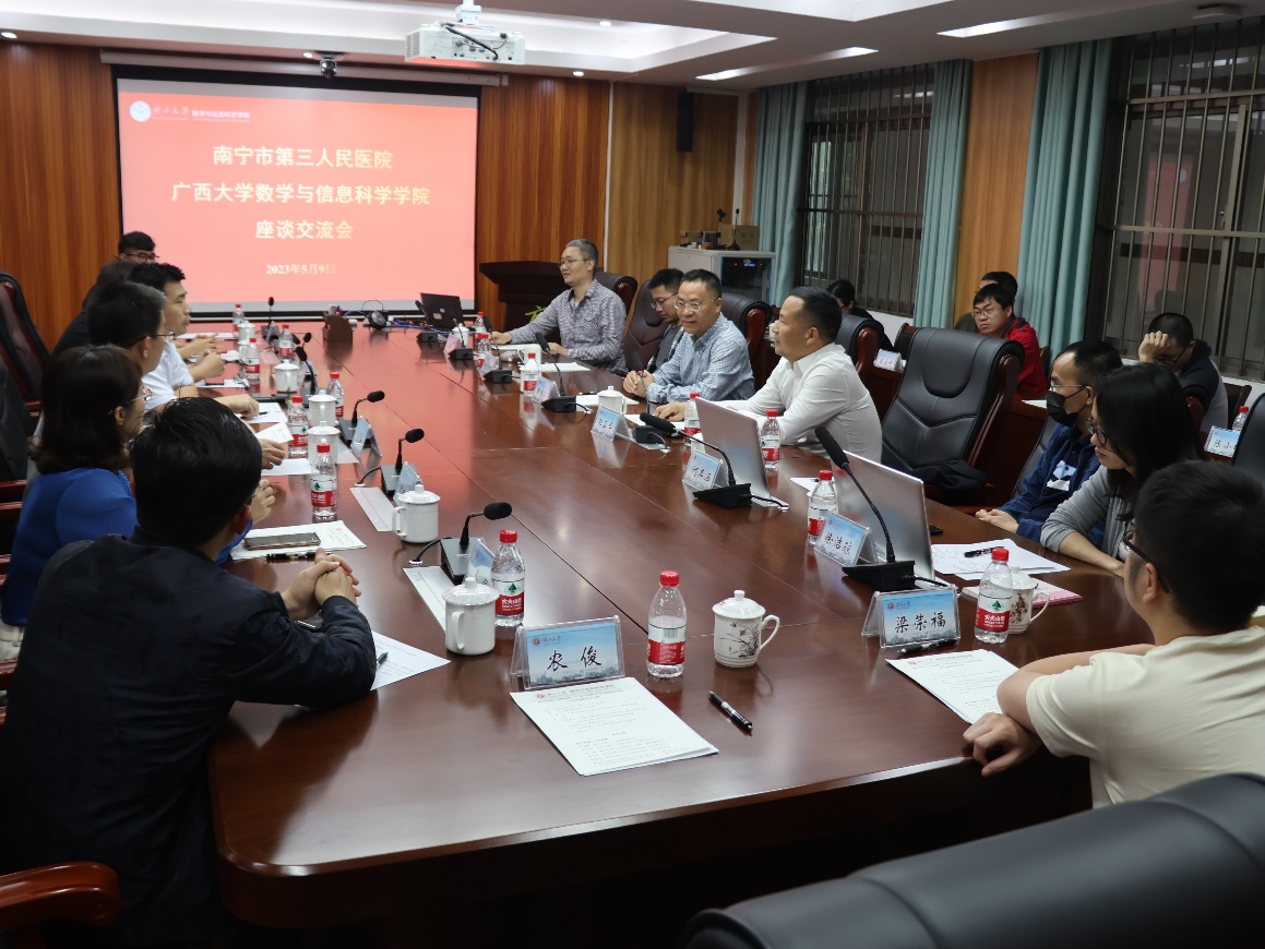 数信学院的人才团队和平台,提高医院的医疗诊治水平,为南宁第三人民医院的高质量发展注入强劲动力。郭真华院长认真听取了大家提出的问题和诉求,积极给与了回应,并根据问题当场组建了三个跨学科研究小组。他指出,数学和医学“联姻”,既要求对医学问题要有深刻的认识,又对数学学科的研究发展提出了更高的要求,用数学实现精准医疗,为医学难题提供数学方案,也是数学学科的光荣使命。南宁市三医院作为心血管专科医院,数学在血液动力学方面的应用潜力巨大、前景广阔,希望双方在进一步合作中优势互补,携手共进,促进互利共赢局面。