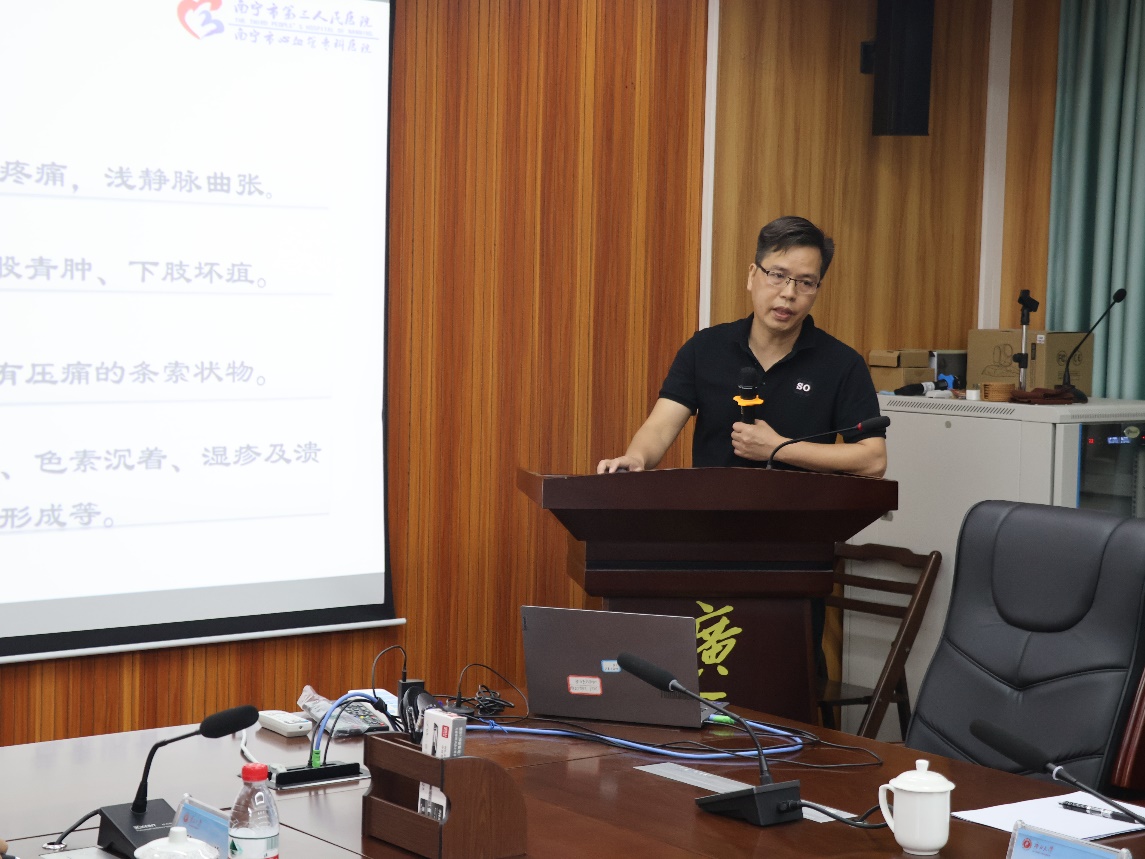 )的建设情况作了介绍。随后,南宁市第三人民医院普外心胸科主任李树松副主任医师作了《下肢静脉血栓》专题报告。他深入浅出、系统详细地介绍了下肢静脉血栓概述、形成机理、病理及生理、分型及治疗、预防等。