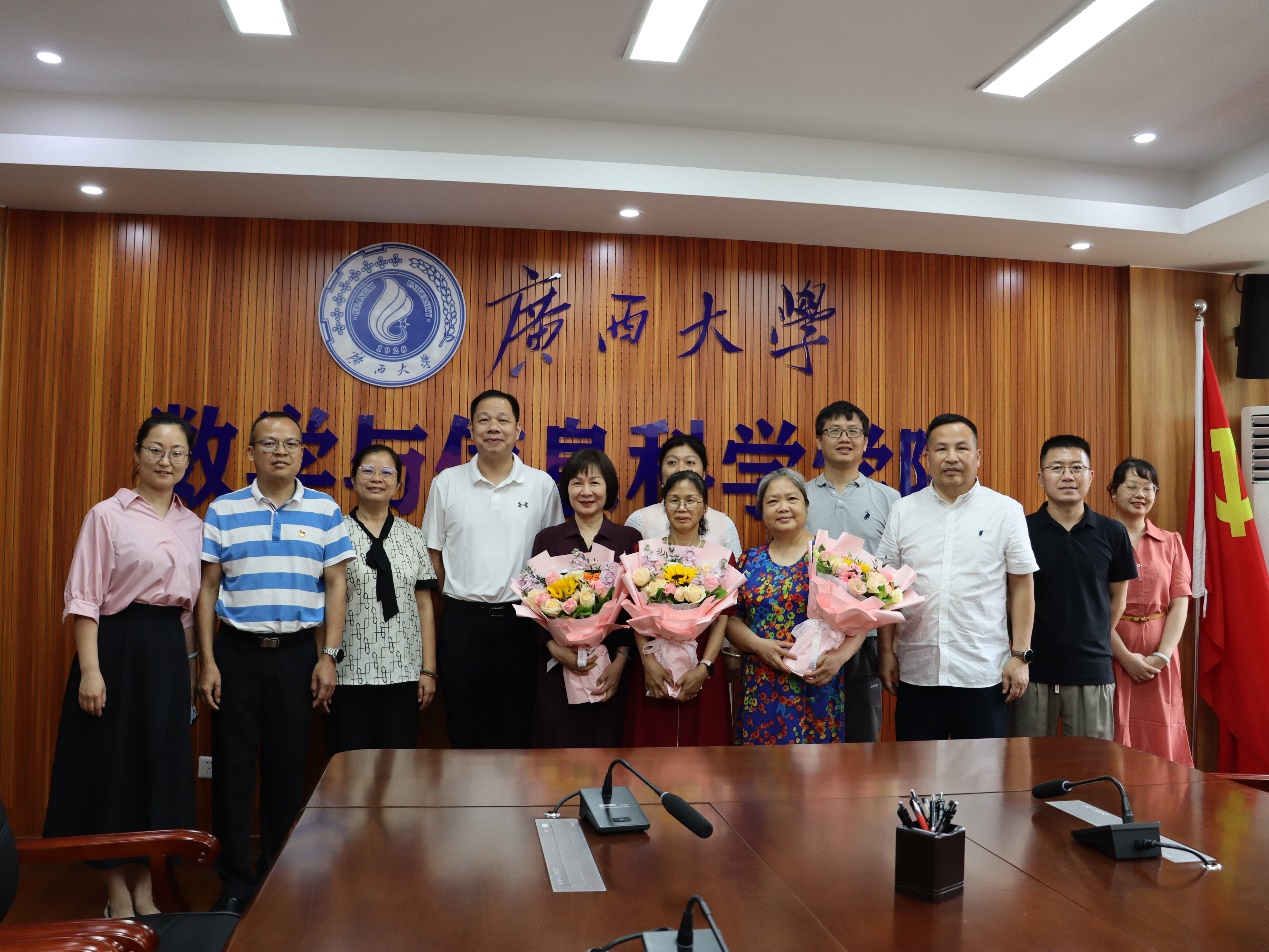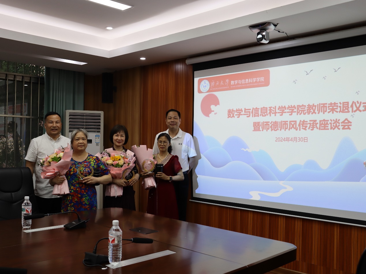 退休教师刘建平、范英梅、卢小梅、郭海燕数十年如一日的默默坚守和无私奉献,进一步增强教师凝聚力,激励学院全体教师传承优良的师德师风。4月30日下午,数学与信息科学学院在214会议室举行教师荣退仪式暨师德师风传承座谈会。院党委书记覃宪儒、院长郭真华、学院领导班子全体成员,荣退教师及教职工代表出席仪式。荣退仪式由副院长石志刚主持。