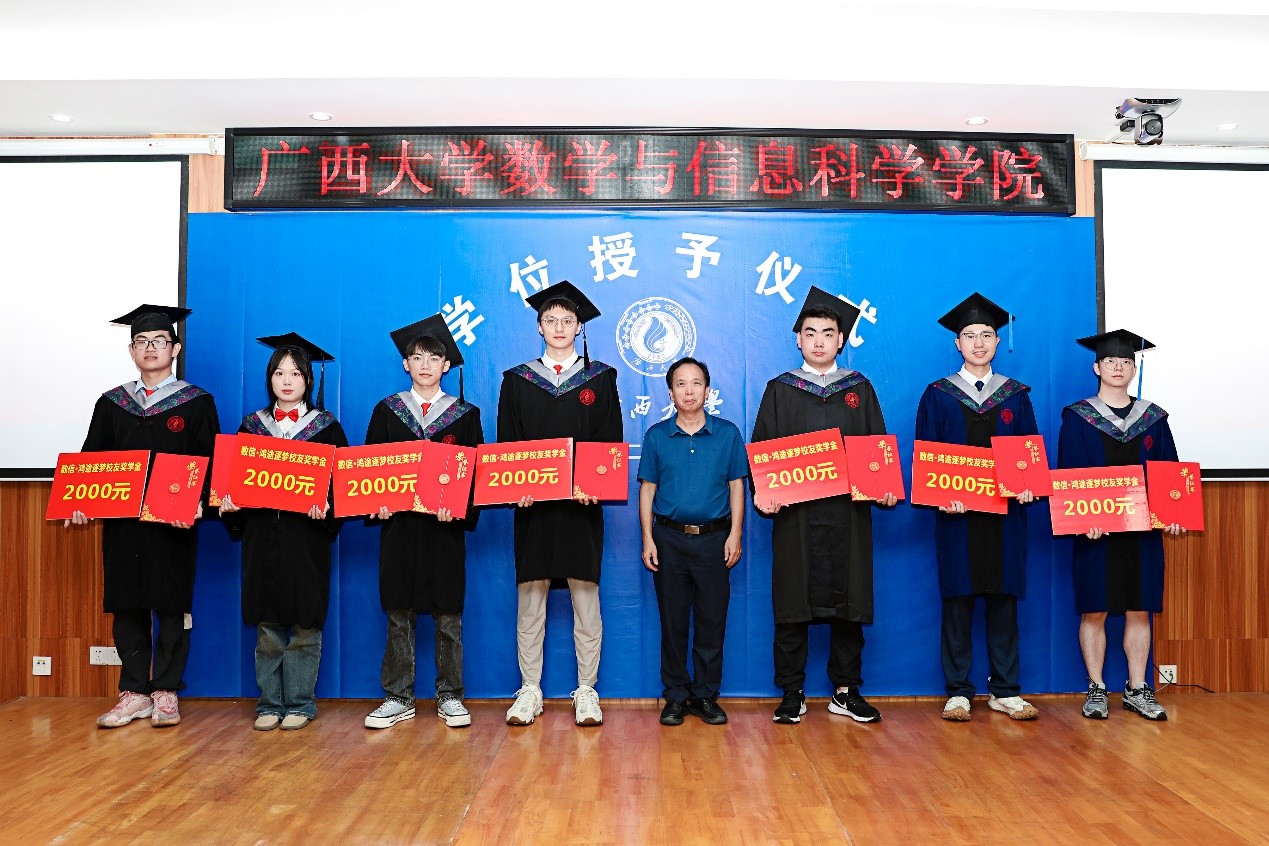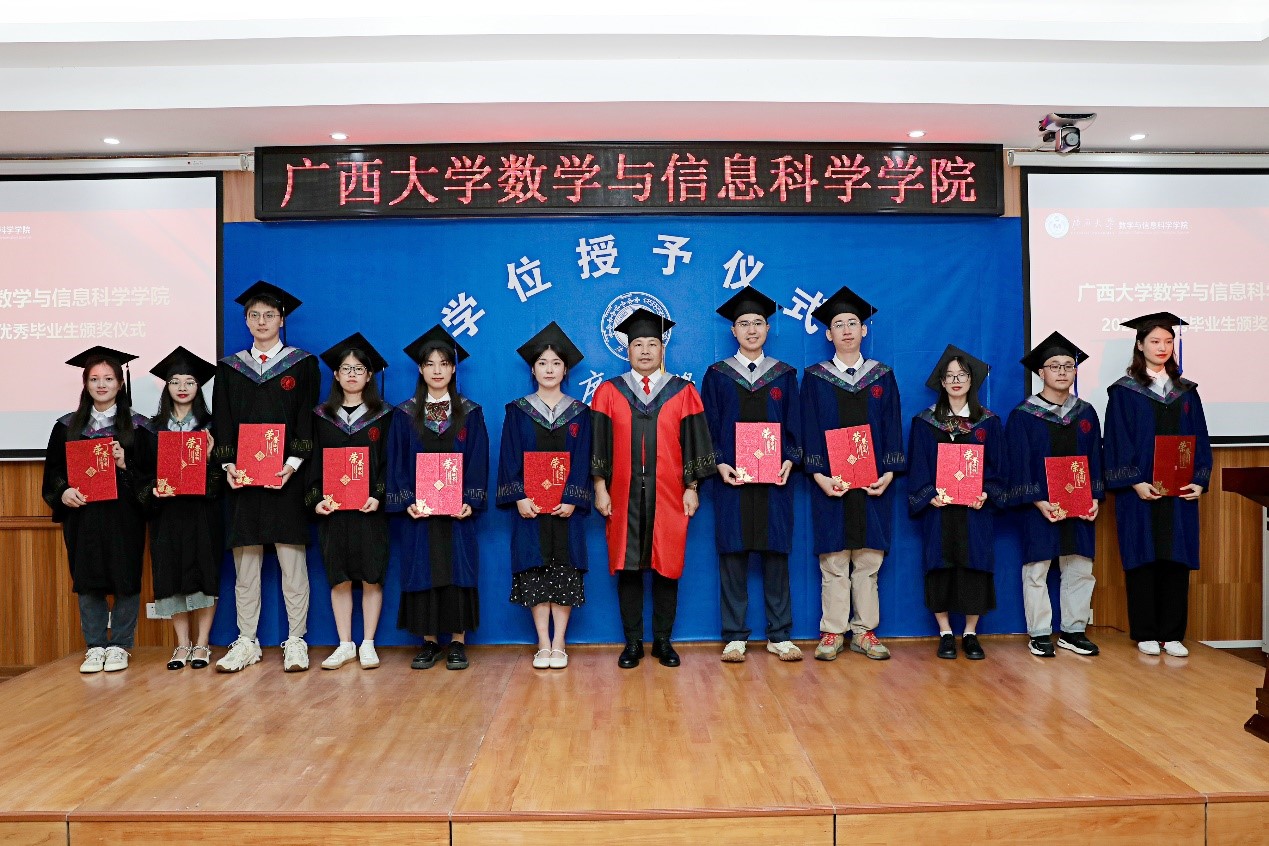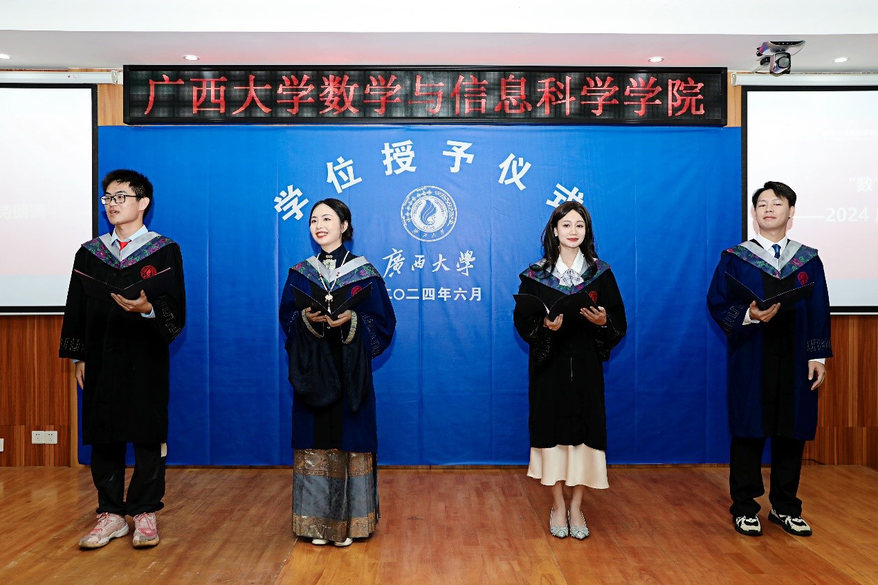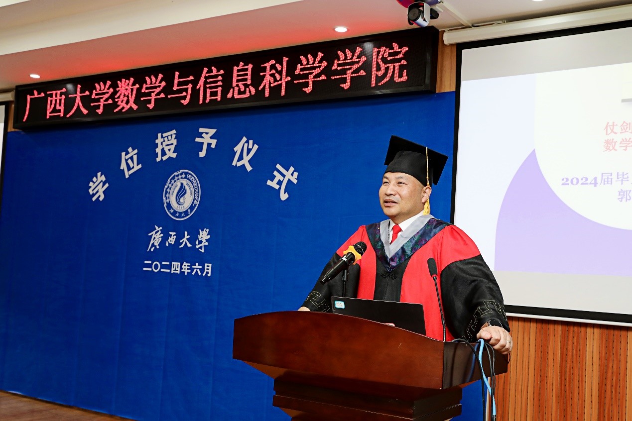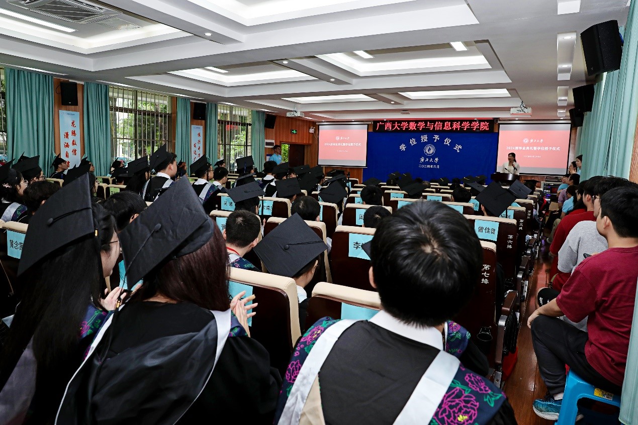 第十四届学位评定委员会数学与信息科学学院分委员会委员、广西鸿途驾培集团董事长连建耀、各系主任、班主任、教师代表、全体辅导员以及2024届毕业生一同参加仪式,仪式由学院党委副书记唐旭彬主持。