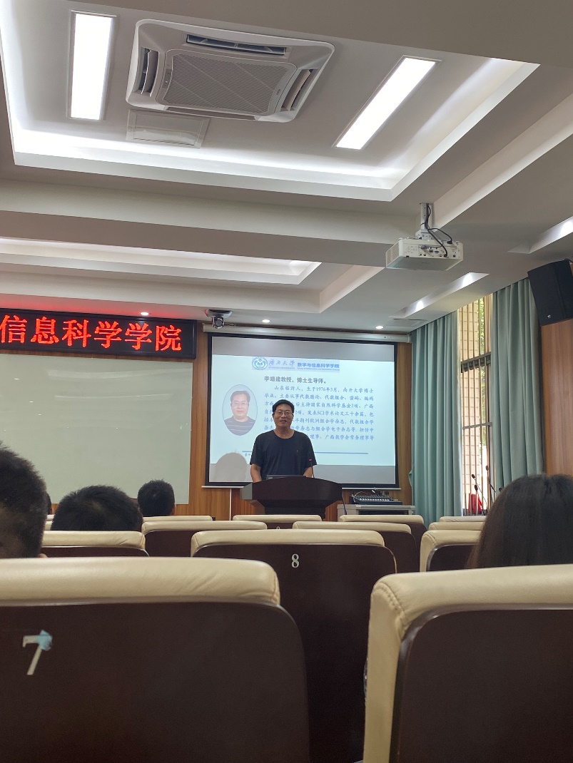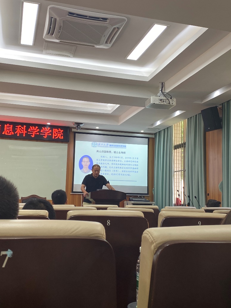 会议开始,袁功林副院长全面介绍了学院的科研发展历程、师资力量以及研究方向。随后,由来自偏微分方程及其理论应用、优化计算与统计、代数函数、几何拓扑这四大核心研究方向的四位导师代表——何其涵副教授、杨宇宁教授、李靖建教授、闫卫平教授,轮流上台,逐一分享了各自团队中每位导师的情况,包括专业背景、所承担的科研项目以及取得的科研成果等。为与会者呈现了生动且充满启迪的科研画卷。会议尾声,导师们与同学们进行了一对一的亲切交流,加深了师生间的了解。