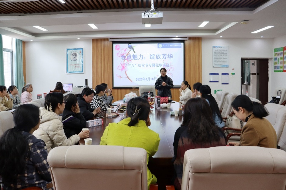 3月18日下午,学院工会在506报告厅举办"妆点魅力,绽放芳华"形象提升专题讲座,邀请高级化妆师于莹老师担任主讲,20余名女教工齐聚一堂,共同开启了一场关于美与自信的探索之旅。于莹结合女教师形象管理需求,通过"理论+实操+互动"三位一体教学模式,系统讲授产品选用、妆容设计、色彩搭配等实用技巧,她通过现场化妆演示,让每位参与的老师感受到妆容背后的自信与力量。