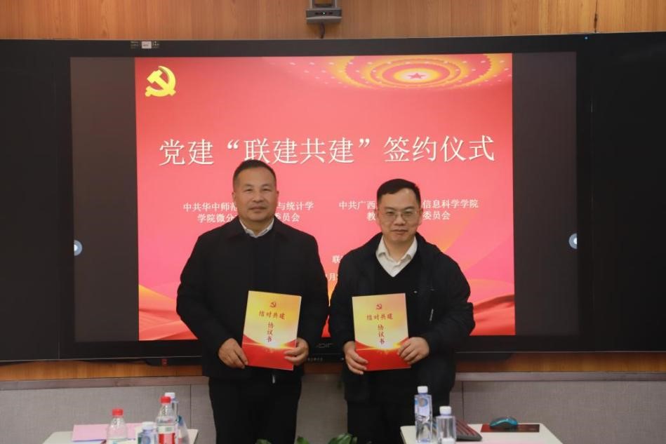 教工第二党支部与华中师范大学数学与统计学学院微分方程党支部举行了党建联建签约仪式,郭真华与华师数统学院院长、微分方程党支部书记郭玉劲签署了《党建联建合作协议》,明确双方通过党建经验交流、党建资源共享、教育教学研讨、课程建设交流、联合开展社会实践和调查研究等方式,提升教育服务和赋能科技水平,深化实践育人成效,合力打造党建工作和教育服务品牌。