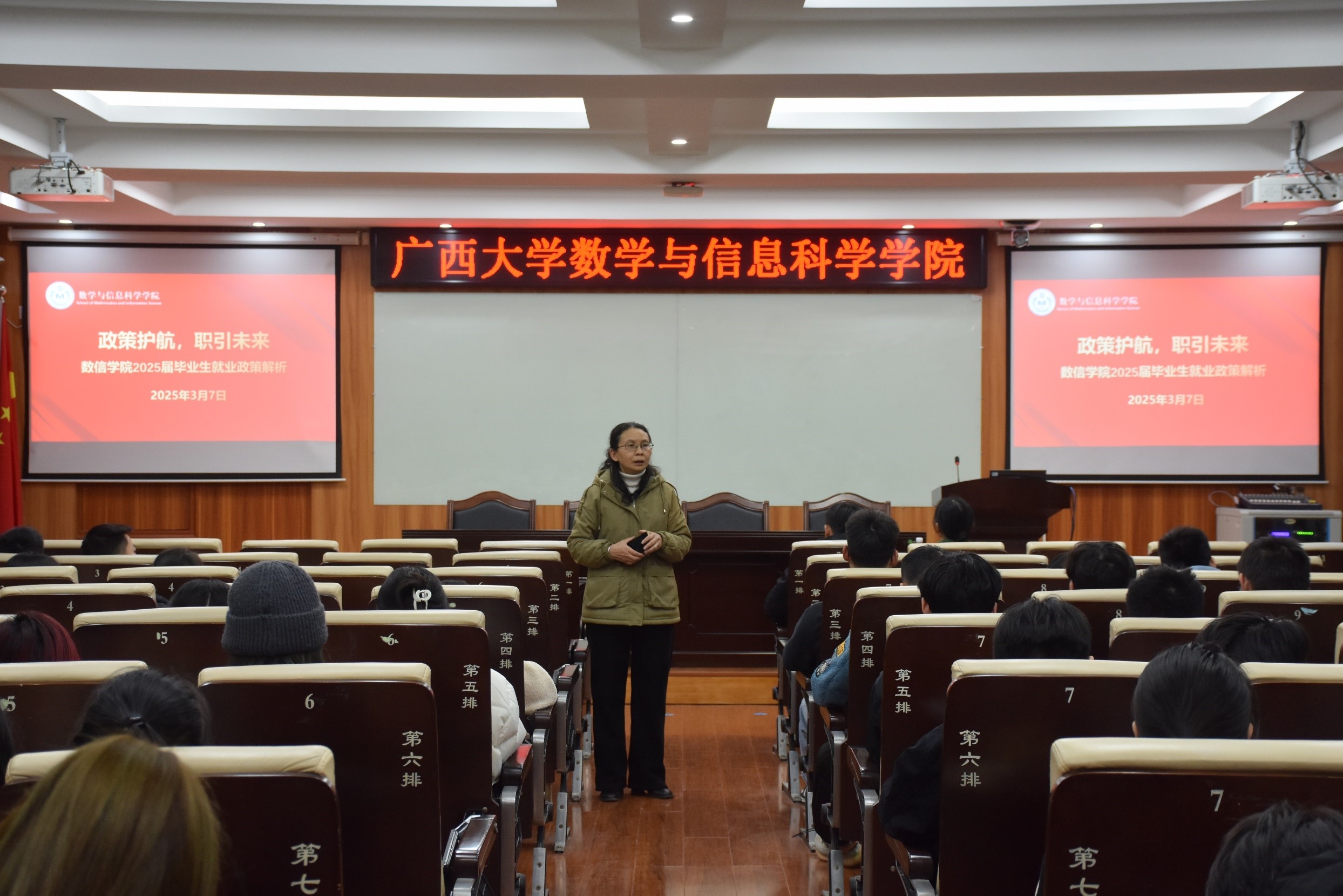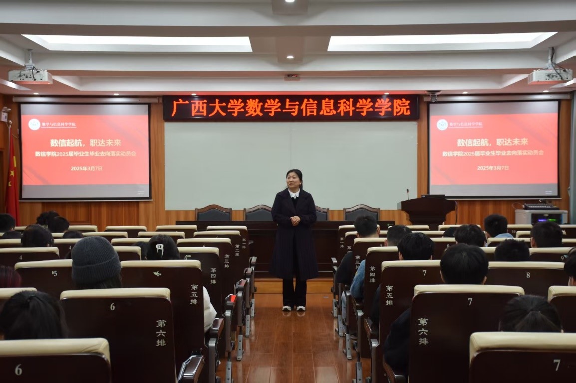 2025年3月7日,数学与信息科学学院在学院报告厅召开2025届毕业生毕业去向落实第三次动员会。学院党委副书记唐旭彬、辅导员刘春霞、2025届全体毕业生参加会议,特邀玉林新世纪高级中学林俊宇校长做求职技能培训。