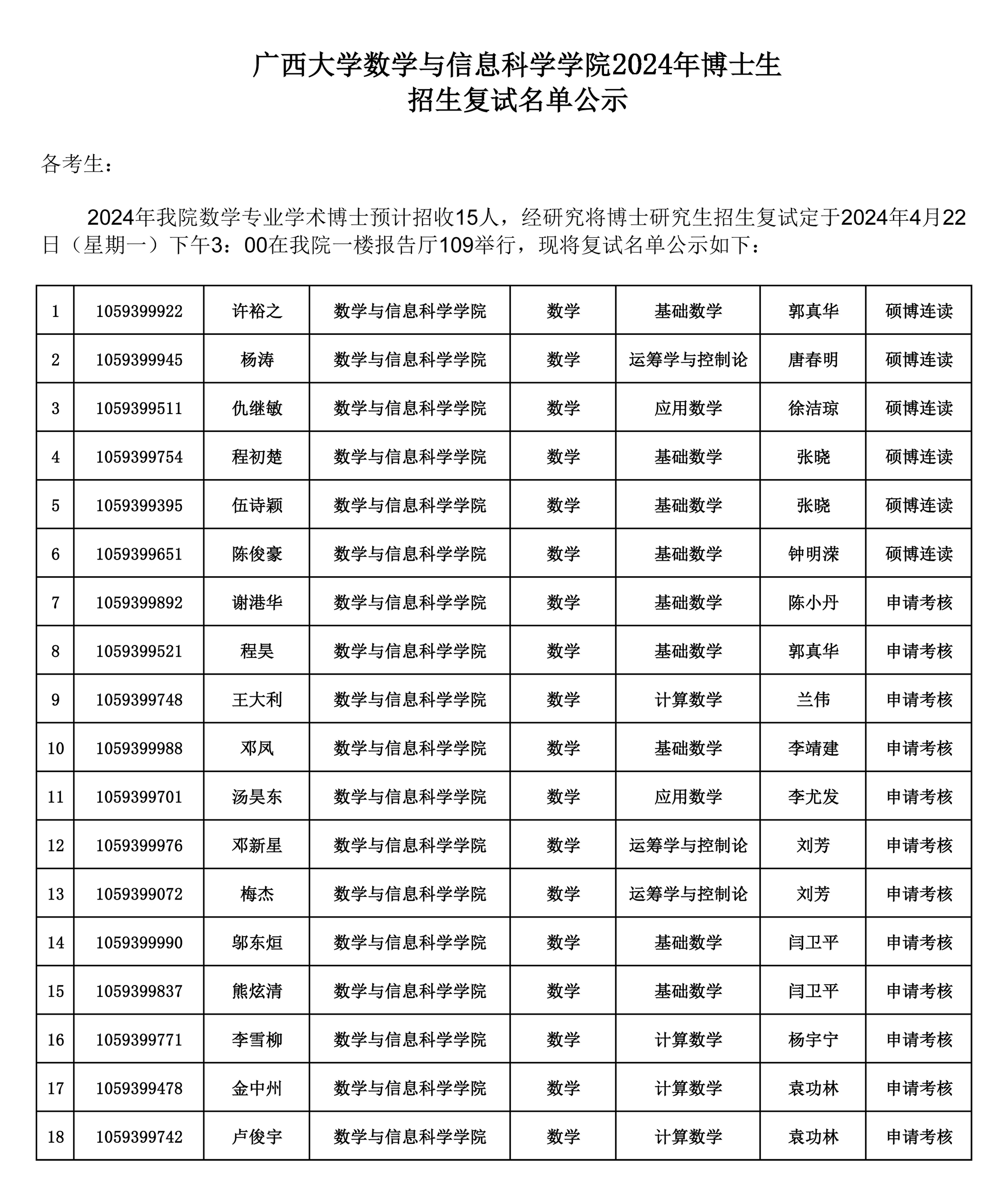 Avgo 数学与信息科学学院2024年博士生招生复试名单公示